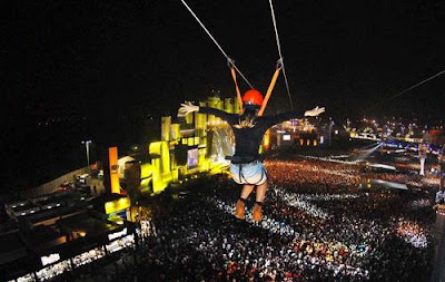 Com o fim do show da Kesha, mais espaço. Tirando algumas grandes cabeças a minha frente, fiquei em um local privilegiado. Contava os minutos. A direita tinha um espaço com tirolesa. As pessoas passavam rápido em cima das nossas cabeças. A vista que elas tinham lá de cima devia ser sensacional. Como desejei estar naquela corda...